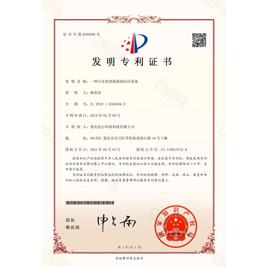 Patent certificate for sewage treatment coagulant reaction equipment
