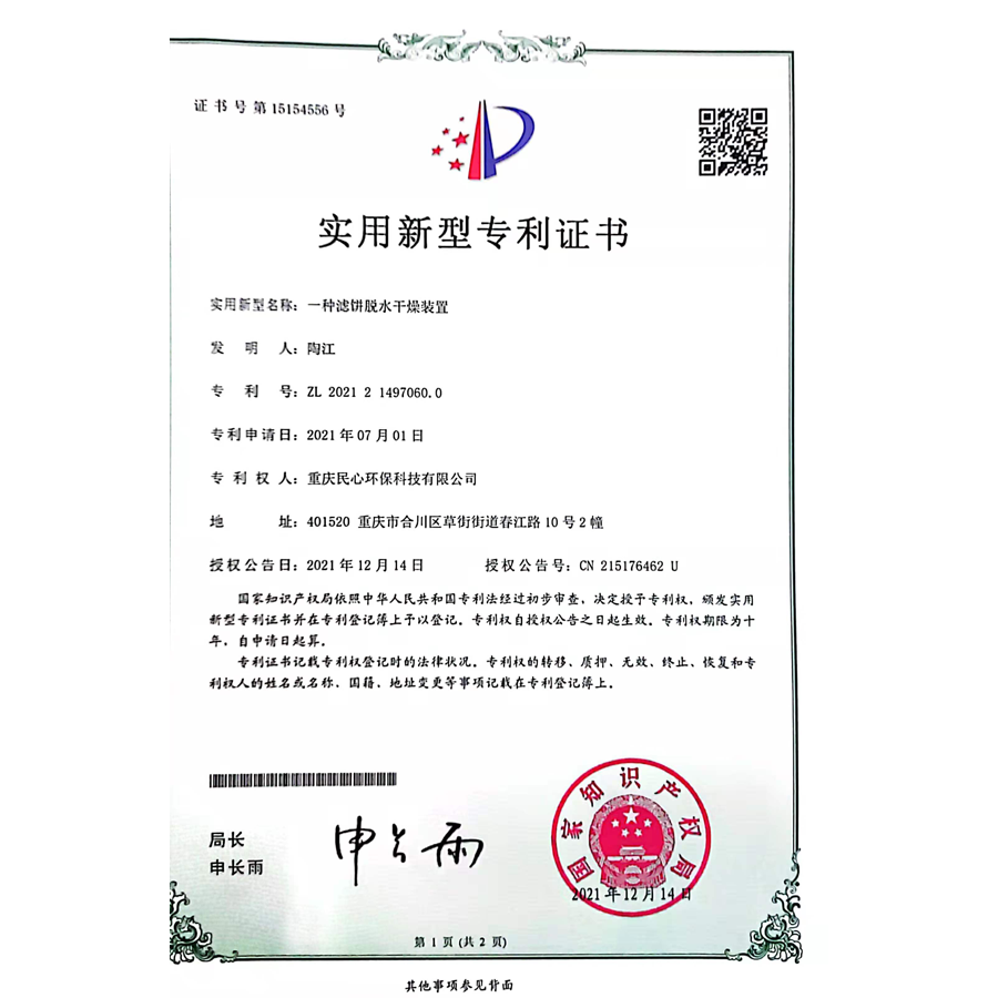Patent certificate for filter cake dehydration and drying device